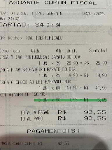 Resumo: Para não gerar um desconforto ainda maior, mantive o pedido e paguei R$ 1,95 em cada embalagem, totalizando R$ 5,85 nas 3.
