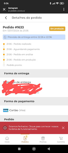 Read morePIOR EXPERIÊNCIA!!! MAIS DE 3 HORAS DE ESPERA POR UMA PIZZA!!!!!!!! Hoje resolvi fazer o primeiro pedido nessa pizzaria (e último). Realizei o pedido às 21: 06 e aguardei pelo prazo especificado pelo link da pizzaria. Decorrido o prazo, entrei em contato para saber sobre o pedido, no qual, fui informada de que estava em produção e que em 30 min seria realizada a entrega. Porém, transcorridas mais de 2 horas entrei em contato novamente, já com muita fome e sono, fui informada de que em 30 min seria realizada a entrega. A sensação de ter sido feita de PALHAÇA, tirada pra IDIOTA é terrível! Pois me vi sem opção para pedir mais nada (tudo fechado) e tendo que esperar pela promessa de entrega. Sobre a pizza, pouco recheio, fria.... e pagar a mais pela de camarão e vir protótipos de camarão foi o ápice de ter sido feita de trouxa. Definitivamente, esse...