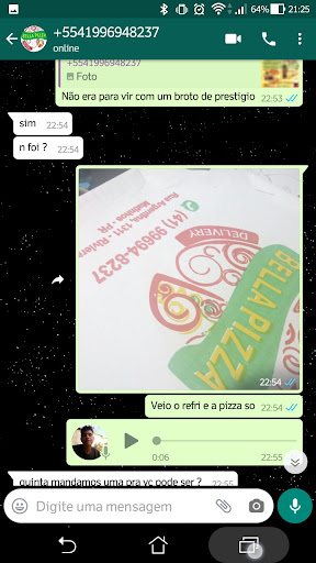Read morePéssimo atendimento, a entrega é péssima, "pizza" chega toda gelada, fiz o pedido as 18:30 e chegou às 21:40. Pizza ruim, ingredientes com gosto de mofo, a batata palha totalmente dura e com gosto ruim, a calabresa da pior qualidade, a azeitona com gosto horrível, 23 reais jogados no lixo, nem os cachorros de rua quiseram. Comprei assim que a bella foi inaugurada, e não melhorou em nada, o mesmo jeito (pessimo) de quando foi inaugurada . comprei depois de 2 anos, pela 2 vez, achando que havia melhorado, pra nunca mais, das duas vezes minha filha passou mal do estômago, algo nos ingredientes deve ser velho, ou vencido. Não é pelo valor mais baixo, que tem que ser feito igual pra bicho. Se for necessário aumenta o valor, e melhora...