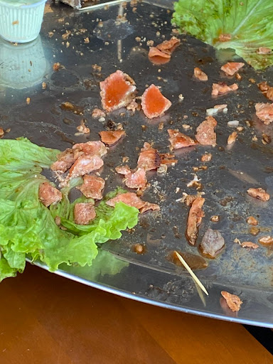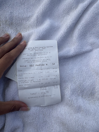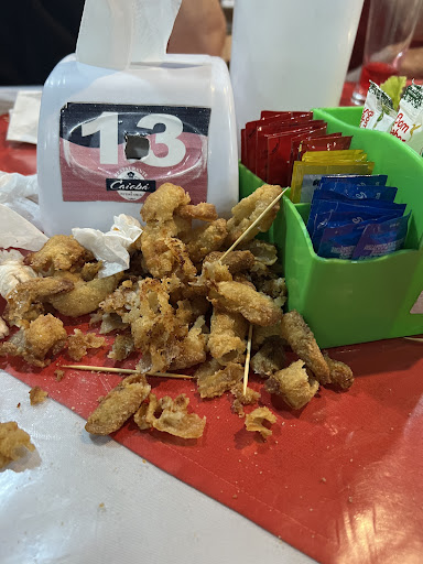 Depois disso, trouxeram uma nova porção de camarão frito, mas novamente uma decepção: os camarões estavam sujos, sem limpeza interna (com o intestino visível). A salada tinha alface murcha e tomate totalmente verde. As mesas estavam sujas, com toalhas de plástico engorduradas e nenhum cuidado visível com a higiene.