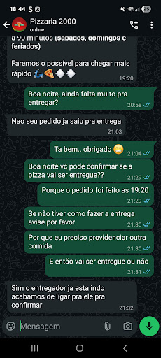 Read moreA pizza da Pizzaria 2000 é, de fato, uma das melhores da cidade, e sempre foi a minha favorita. No entanto, o serviço de delivery deixa muito a desejar. Em diversas ocasiões, fui informado que o pedido chegaria em 40 minutos, mas acabei esperando no mínimo 2 horas. Isso já aconteceu comigo mais de 3 vezes, o que é bastante frustrante. Inclusive, neste exato momento, estou aguardando uma pizza que, segundo o sistema, saiu para entrega há quase 50 minutos. É uma pena que a qualidade do produto não seja acompanhada por um serviço de entrega mais eficiente. Então, caso não queira ficar com fome, ou esperar bem mais que o desejado, peça em outro local! Inclusive é o que farei...