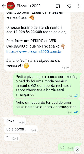 Hoje decidimos que nossa janta seria pizza e acabamos não fazendo janta, até aqui tudo bem, escolhemos a 2.000 para fazermos nosso pedido (infelizmente) resolveram entregar no endereço errado (não foi culpa do moto boy, que foi bem Gentil), resultado a pizza chegou com quase 1h de atraso, o refrigerante chegou quente e a pizza gelada.