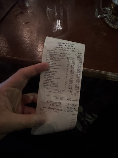 Fui ao Aldeia do Sol com amigos e abriram uma única comanda para toda a mesa. No final, por ter ficado até o encerramento, me empurraram R$ 200,00 a mais do que eu realmente consumi.