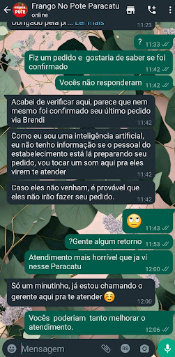 Read moreExperiência Ruim! Estava recém operado, sem condições de cozinhar e fiz um pedido as 21:21 com informação de saída para entrega às 22:03. 22:33, meia hora depois fiz contato pelo whatsapp porque não atendem ligações, e perguntei sobre o pedido, fui simplesmente ignorado. Apenas tive resposta do vácuo, após dizer que iria lá pessoalmente. Devido a falta de interesse em me atenderem consegui cancelar o pedido às 22:55, recebi o estorno do Pix, mas não avisaram o entregador e este apareceu as 23:14 para entrega do pedido já cancelado. Que obviamente foi por mim recusado. Não recomendo. Eu não peço mais, que arrependimento. Não sei se é o próprio proprietário ou funcionários que operam o contato do whatsapp, mas seja quem for, precisa aprender trabalhar melhor a escuta pra entender o que cliente deseja sem decorebas ou frases prontas ou o silêncio. Me senti muito...