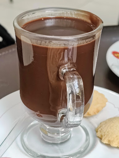 Como estava fazendo frio e ainda era manhã, experimentamos o chocolate quente com um simples pão na chapa com manteiga. Recomendamos muito esse chocolate quente, feito no capricho. Em seguida, traçamos um bom pedaço de bolo fresquinho.