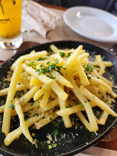 Pedimos a batata frita trufada com parmesão. A foto, no cardápio, desvirtua do produto que servem. Você vê uma batata artesanal, fininha, com casca, bem frita, com o queijo caramelizado por cima. E você recebe uma batata congelada, pálida, com parmesão de saquinho espalhado pela batata, com azeite trufado barato espalhado. Vergonhoso.