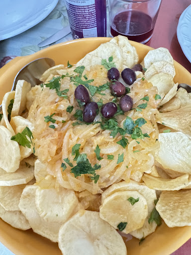 Quanto à comida, tudo o que experimentei foi delicioso e autêntico, apresentando sabores e aromas típicos da culinária portuguesa. O prato principal que pedi foi o bacalhau à Gomes de Sá, que estava perfeitamente cozido e bem temperado, acompanhado de batatas e cebolas douradas e macias.