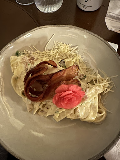 Já para o prato principal, cada pessoa pediu um diferente. A parmegiana era imensa e veio com batatas fritas bem crocantes. O bife ancho era acompanhado da salada da casa e estava ao ponto. Pelo menu do chef, veio o gnocchi de queijo. E, para mim, pedi o spaghetti all'amatriciana, que veio em uma cama de foundie e com um molho de tomates com guanciale, a combinação fez com que esse prato entrasse pra lista das melhores massas que já comi, estava perfeito! Ah, todos os pratos eram MUITO bem servidos e estavam uma delícia.