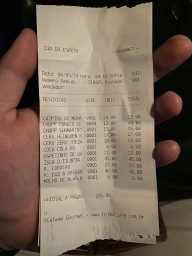 Fui cliente do Cia do Espeto por mais de 10 anos, mas infelizmente, na última visita, fiquei extremamente decepcionado com a queda significativa na qualidade do atendimento e dos produtos. Pedi uma caipirinha de morango com vodka, que estava mal preparada e imprópria para consumo. Ao informar o garçom sobre o problema e solicitar o cancelamento do pedido, com base no meu direito previsto no Código de Defesa do Consumidor (Art. 18, que trata da inadequação de produtos e serviços), ele se recusou a cancelar, devolver e trouxe outra caipirinha, que também estava igualmente ruim. Ao final, quando solicitei o cancelamento ao caixa do valor de R$19,00 da Caipira , em minha comanda de R$250,00 , novamente com base nos meus direitos previstos pelo CDC, fui tratado com extrema arrogância pelo garçom e pelo responsável pela bebida. Eles não só se negaram a cancelar o item, como também alegaram que eu havia consumido o produto, mesmo tendo deixado a bebida intocada na mesa. Foi uma experiência extremamente frustrante e desrespeitosa. Não recomendo o estabelecimento a ninguém !