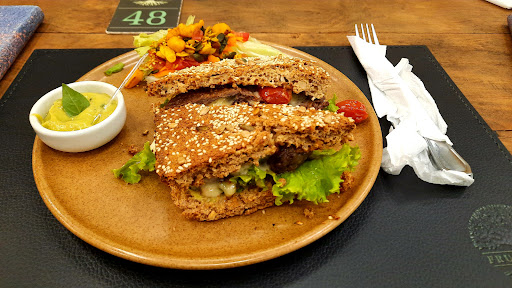 Ambiente contemporâneo e de bom gosto, limpo, com várias mesas e estacionamento.
