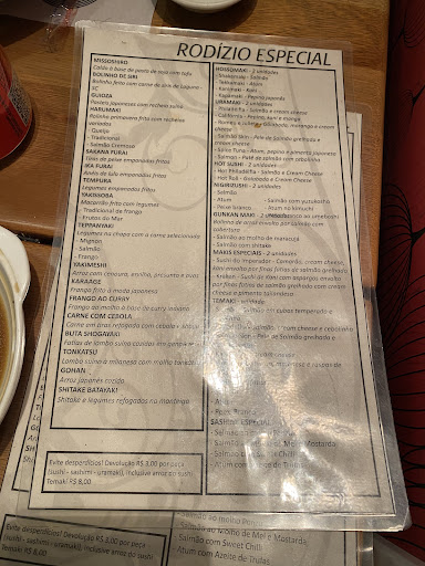 Read moreConstrangimento do início ao fim. Sou de Maringá e vim comer com a família da minha namorada. Estávamos em 4 na mesa. Primeiramente, sentamos no local em que fiquei de frente ao sushi man que fazia os pratos. Solicitei o rodízio especial. Demora demasiada em trazer os pedidos, poucos funcionários para atender o local, e um dos sushi man constantemente olhando para a nossa mesa quando fazíamos os pedidos. Ao entrarem mais clientes, vimos a face do mesmo rapaz com olhar de desânimo/desaprovação. Que sensação horrível um rodizio de R$155,00, com 10% de taxa e ter essa sensação de recriminação. Por fim, pedi a conta e o caixa já foi falando o valor, nos apressando, não nos forneceu inicialmente a nota do serviço. Geralmente é corriqueira a emissão de nota para conferência. Fizemos a devida solicitação. Em suma, é um valor muito mais caro que em minha cidade, em outras também, por um cardápio básico para um rodízio. Precisam melhorar nos quesitos mencionados acima. Até o momento...