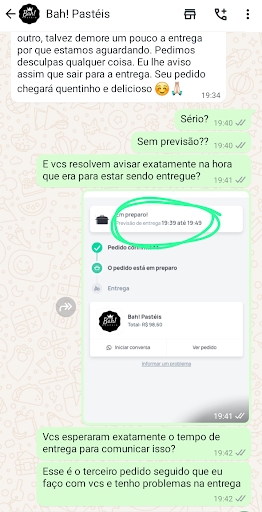 Era bom, agora nunca mais! Foi o terceiro e último voto de confiança e confesso que me arrependi profundamente. O problema deles? ENTREGA. A desculpa? Motoboy. É sempre o motoboy... Hoje, não diferente das outras, fiz o pedido próximo das 18h30. Prazo para entrega 19h39 até 19h49. Às 19h34, conforme foto anexa, eles resolveram mandar um whatsapp avisando que não tinham motoboy e simplesmente não dando nenhum outro prazo. Então se atentem, principalmente se estiver com fome... Eles esperam expirar seu prazo para avisar que não vão cumprir o prazo. As desculpas são sempre as mais diversas (motoboy caiu, motoboy não veio e...