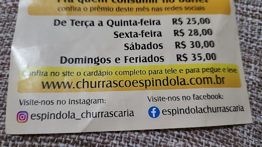 Read moreEspíndola sempre com as suas surpresas, comida do buffet sao boas, local limpo, atendimento sempre o mesmo l, nunca foram de dar atenção aos clientes. Mas hoje se superaram, comprei 600 gramas de vazio assado, no valor de 70 reais, até aí tudo bem, pro bairro é valor alto mas se tem qualidade está tudo bem. No entanto a surpresa, a carne era requentada, isso mesmo, carne de ontem ou sei lá de quando, apenas aquecida. Então fica aqui a minha avaliação, pelo menos a salada de...