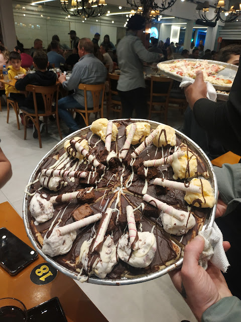 Read moreUm velho amigo sempre dizia "só se decepciona quem cria espectativas". Foi o que aconteceu comigo. Li diversos reviews aqui sobre o lugar, todos tecendo uma série de elogios, elevei minha espectativa baseado em experiências com pizzarias realmente boas que já fui e quando cheguei lá a decepção foi enorme. O lugar é enorme, e isso atrapalha de forma significativa a quantidade de ruído, já que não há qualquer tratamento para tornar o ambiente mais aprazível. Os garçons que chegam às mesas em trupes de 3 a 5 pessoas, cruzando seus braços uns sobre os outros para oferecer a sua pizza da vez e falando como se fosse uma feira de rua para que o cliente, que sem nem entender o que são os sabores, escolha pela sua pizza (me pergunto se eles recebem comissão por pizza, ou salario). Pizza de frango deve ter uns 6 tipos, passando toda hora, enquanto demais sabores leva horas pra passar, e quando chega é necessário procurar sobre um mar de queijo o elemento que deve dar nome ao sabor (os diversos comentários que relatam que a pizza é boa de cobertura na versade eu identifiquei que o que tem é somente queijo). Camarão, cadê você? Tive que ensinar para um garçom o que é peperoni pois ele queria me servir um pizza de calabresa, sendo que a de peperoni estava na bandeja ao lado. Fui colocado em uma mesa que fica exatamente em frente as portas de serviço e dos banheiros, poderiam ao menos fazer um biombo separando um pouco melhor as portas desses locais com o ambiente do salão. Deixar dois pratos e dois conjuntos de talher por pessoa, não sei, não me parece adequado... Se o garçom vai ter que retirar os pratos das pizzas salgadas antes de servirem as doces, não tem motivo pra deixar os dois pratos para o cliente, parece que é para economizar tempo. Por fim, há somente um (isso, 1) cardápio com a relação de sabores, para mais de 200 clientes comendo ao mesmo tempo. Eu solicitei e tive que ficar esperando. Ponto positivo :...