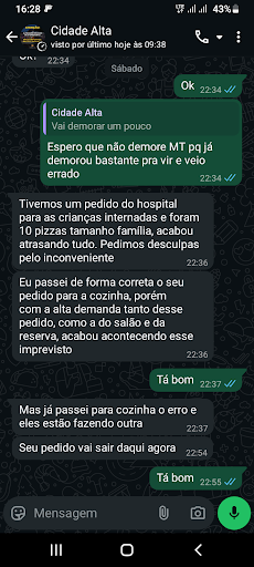 Gostaria de relatar a minha insatisfação com a pizzaria nesse fim de semana. Fiz o pedido pelo site e enviei ao whats tudo como tem que ser. Demoraram 20 min pra me atender/dar retorno, é muito tempo! Se eu vou no restaurante e demoram tudo isso pra me atender eu levanto e vou embora, mas como o pedido foi pelo whats e já tinha pago por pix não tinha o que fazer a não ser esperar!!! Depois de muita demora a pizza veio, mas com os sabores errados. Entrei em contato com o estabelecimento e fiquei sem resposta por 4 minutos sendo que era só o responsável pedir para fechar a pizza e devolver e me mandar a pizza correta! Eu sinceramente não sei o pensaram, se eu deveria aceitar e ficar com uma coisa que não pedi. Enfim obtive a resposta que iriam enviar outra pizza, mas que ia demorar um pouco, o que eu acho um absurdo! Eu já trabalhei anos em cozinha e quando se tem um pedido errado que volta por erro do estabelecimento, prioridade é toda dele! Vieram com desculpas que pediram pizza no "hospital pras crianças internadas" 10 horas da noite, me tratando como se eles tivessem fazendo um favor pra mim. Ah, meu filho também é criança e ficou com fome esperando 2 horas, que foi o tempo que levou pra chegar a segunda pizza que veio completamente avacalhada! Eu nunca comi uma pizza tão ruim na minha vida, E pagando caro o por isso! Muito pouco recheio e veio toda revirada, completamente salgada, o sabor da casa então nem se fala, era o meu favorito! Entupiram de alcaparras, uma especiaria cara sendo disperdisada em abundância, se colocassem de coração o que puseram de alcaparras eu até daria mais uma estrela. A pizza doce veio queimada também! Chocolate com gosto de açúcar queimado. Caiu muito a qualidade, tanto no atendimento quanto na produção! Sou cliente antigo, as vezes dou um tempo, mas ultimamente ando pedindo todo sábado e sinceramente não sei se vou tornar a pedir novamente pois nem um mísero pedido de desculpa recebi...