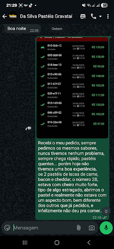 As imagens falam por si só! Infelizmente perderam um cliente ativo, vários pedidos pela plataforma deles e que antes já havia pedido pelo ifood tbm! É complicado gastar pra comer um lanche em família e ter essa experiência desagradável de nem conseguir engolir por conta do gosto e do cheiro de podre... mesmo assim tentei dar mais uma chance, pois nunca tivemos oq reclamar dos pedido anteriores assim como disse no momento do ocorrido. Porém no dia seguinte tentei reaver os pastéis assim como combinado e fazer um novo pedido, simplesmente não me responderam mais, chamei de outro número e responderam na hora, passaram informações que solicitei, mas e essa minha mensagem sobre os pastéis foi ignorada!...