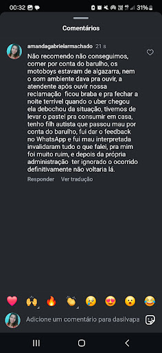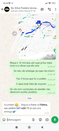 Read morePedimos muitas vezes, pastel muito bom. Mas o que aconteceu ontem eu ainda não consigo acreditar, pedimos 4 pastéis as 21:44 com previsão de entrega entre 40 e 60 minutos. As 21:50 comecei a pedir uma previsão de entrega, as 23:25 fui informado que o motoboy já tinha saído... Porém não recebemos nada, as 01:07 recebi uma msg que o pedido tinha saído para a entrega. Simplesmente não recebemos nada, nem os pastéis, e nenhuma satisfação, completa falta de respeito com o cliente. Era só ter falado que não tinham como entregar seria muito mais inteligente....