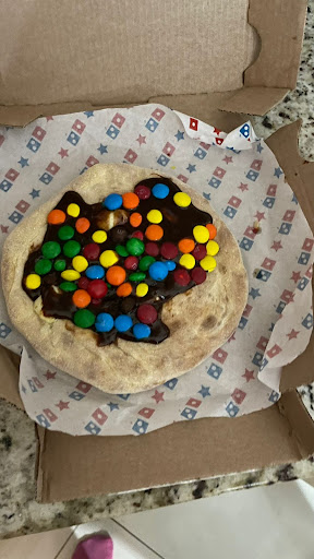 A pizza e o chocobread tinham gosto de qualquer coisa, menos chocolate. Além disso, pouco recheio/cobertura. Pura massa! Os pontos positivos foram que a massa não é ruim e até colocaram uma quantidade boa de M&Ms (mas que não ficam bons devido ao gosto péssimo desse chocolate "fake" de base)