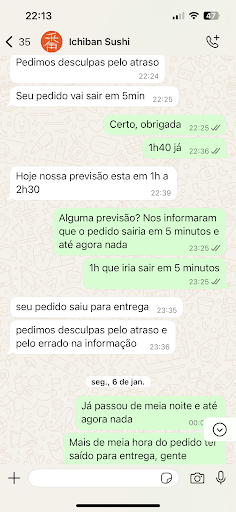 Continuei aguardando e, depois de mais 30 minutos, enviei outra mensagem e tentei ligar para entender o que estava acontecendo. A resposta foi a mesma: “pedimos desculpas pela demora, o motoboy saiu para entrega”. No entanto, o pedido só chegou mais de 30 minutos depois, totalizando mais de 3 horas de espera.