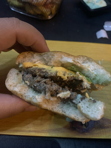 Hambúrguer: Ao chegar, fomos atendidos e escolhemos o refrigerante, recebendo uma garrafa de 2l, o que não foi muito inteligente, já que não bebemos nem metade do refri. Também foi colocado um rolo de papel toalha na mesa. A carne oferecida é bem temperada e saborosa, porém é notavelmente menor que a circunferência do hambúrguer, dificultando a montagem completa do sanduíche. Os molhos e acompanhamentos são saborosos, mas senti falta de variedade de queijos além do molho e das fatias de cheddar. O molho estava bastante líquido e a farofa de bacon tinha gosto de farinha de milho velha. As batatas fritas são feitas no mesmo óleo que os outros itens do buffet, resultando em um sabor misturado e uma textura encharcada.