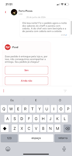Read moreSolicitei a pizza nos sabores do chef (pesto de berinjela, tomate seco e palmito), de panela com cebola (carne de panela e cebola) e quatro queijos ( parmesao, gorgonzola, provo e mussarela). A do chefe veio sem berinjela e com tomate normal, a de panela com cebola veio em cebola e a de queijo veio com mussarela e cheddar apenas. Ao reclamar pelo ifood pedindo o cancelamento do pedido tive que ler “que eu estava de brincadeira” afinal tinham me enviado o pedido. Sim enviaram, completamente errado. E ainda são extremamente grosseiros na resolução do...