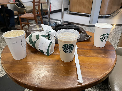 Read moreFiquei sabendo pelas avaliações que são 2, pois bem, evitem o da entrada do aeroporto. Fomos ontem dia 08/07/23, a menina que nos atendeu parecia estar morrem de tristeza (isso que era sábado, se fosse hoje, domingo, acho que ela tinha atirado na gente), com uma cara fechada, apática e deu um sorriso congelado que durou poucos segundos na hora de nós atender. Pedi dois cafés (parecia café com leite normal, horrível, de pó), quando digo normal, não é o mesmo café que conheci no centro de portão Alegre, supremo, encorpado, etc. A menina do copo, não te indica nada, só manda olhar no cardápio, sem pró atividade. O pessoal que te entrega os pedidos, igualmente mortos, sem alma, não te agradecem, não te olham (é mais fácil por robôs ali), ou seja, sofridos. Não te entregam bandejas (leve tudo na mão, te vira) e ainda erraram o pedido (era brownie, não rosquinha, semmm orrrrrr). A menina pôs corações nos copos, mas acho que na sua literalidade, queria por caveiras (risos), pois oh coisa mórbida! Kkkkkk Não...