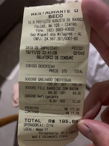 Pontos negativos: Não tinha cardápio para todos (eu e minha noiva revezamos um). São poucas mesas, então minha dica seria para investir em mais cardápios, mesmo que sobre um pouco; Quando fiz o pedido o garçom não anotou nenhum dos 2 pratos e nem a bebida (2 cocas), pensei comigo: “ele vai esquecer”. E aconteceu rsrsrsrs; Depois de 30 min não tinha chego as cocas ainda, eu pedi novamente para o garçom, ele trouxe apenas 1 coca, até aí ok, tomamos aquela e dps pedimos outra. O garçom veio na nossa mesa 3 vezes para confirmar qual era o pedido, e na terceira fez já tinham se passado mais de 40 minutos, foi aí que o sinal de alerta ligou. Virei pra minha noiva e disse: vai demorar rsrsrs; Tinha um pessoal brigando do lado de fora na calçada, o que gerou muitos xingamentos e discussões. Não entendi o motivo, mas parecia ser por algum pedido que nao tinha chego. Comecei a ficar mais preocupado ainda; Pessoas que chegaram depois da gente, receberam os pratos primeiro que nós. Comecei a ficar bem chatiado, já que fazia 1h30 que estávamos esperando, sem notícia alguma do prato. Minha dica seria para sempre dar uma satisfação ao cliente. E a pior parte da noite foi… nosso prato chegou exatamente 22:30, ou seja, duas horas de espera :/ comemos em 10 min e saímos 22:40 (vide foto anexo) Víamos os pratos de outras pessoas que chegaram 21h/21:30 chegando antes de nosso. o restaurante fecha as 22h, porém não pode mais nada de cozinha pro garçom, dps das 21:30, inclusive a sobremesa. Ou seja, como nosso prato chegou 22:30, ficamos sem o doce. Quem saiu perdendo foi o próprio restaurante. Acredito que isso de fechar 22 horas deve ser para novos clientes que desejam adentrar ao restaurante, e não aos clientes que já estão lá dentro.