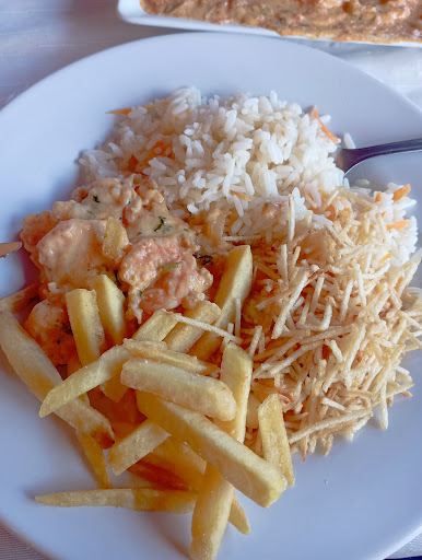 Em meio a natureza e animais, comemos um camarão chiclete MUITO gostoso, acompanhado de fritas e arroz. A quantidade é suficiente para dois adultos que comem bem. Eu saí de lá mais do que satisfeita, e olha que eu como bem! Caipirinha muito boa também.