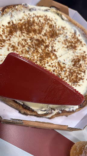 E não bastasse o desconforto, chegou a nossa pizza, PASMEM!!!!! A mesma atendente informou que NÃO PODE CORTAR A NOSSA PIZZA DOCE, (a salgada vem cortada), mesmo nós pedindo, por favor, pq o cortador de plástico não conseguimos corta-la. (Na foto, pizza doce sem cortar, e a salgada cortada)