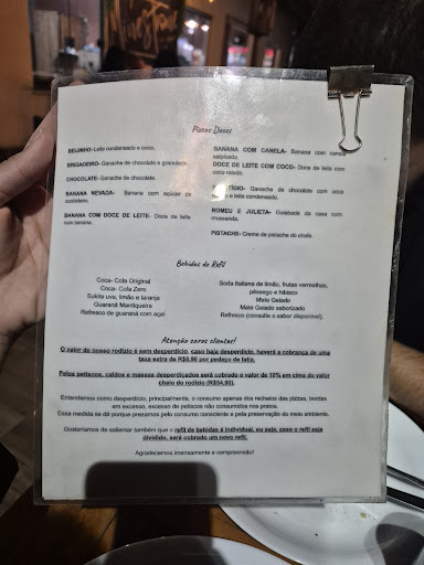 Ao chegarmos, notamos que os pratos e talheres estavam engordurados, o copo em que me serviram refrigerante estava trincado, e o ambiente em geral apresentava sinais de descuido com higiene e organização. As pizzas servidas eram de baixa qualidade, com massa dura, excesso de sal e um queijo de sabor desagradável. O chamado “rodízio de massas” se resumia a uma única travessa de macarrão parafuso. Já os caldos oferecidos — apenas caldo verde e mocotó — estavam sem sabor. O mocotó, em especial, parecia mais água com corante do que qualquer prato minimamente bem preparado.