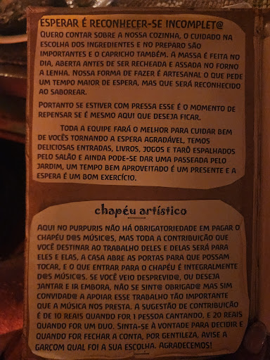 Read moreSimplemente fantástico! Lugar lindo, charmoso, muito bem organizado, limpo e tudo de bom! Atenção para o local onde o gps envia a rota: Eu fiz a correção do endereço no Google Maps em 09/11/2019 e hoje em dia o endereço no GPS está correto. De qualquer modo, você poderá também ir pela placa que fica a caminho de Visconde de Mauá (para quem vem de Maringá) entrando pela estrada do vale das Cruzes que é uma estrada de terra sem sinalização. Siga em frente por aproximadamente 1,5km e verá o purpuris à sua esquerda. Destaque para a truta defumada que era um prato temporário em nov/2019. Ouvi falar que a pizza é sensacional. A sobremesa de banana flambada com calda quente é sensacional. Atendimento de primeira linha, pode ser comemorado aniversário de casamento e datas importantes porque o lugar é um...