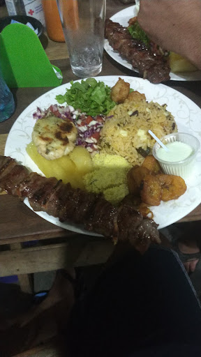 Pedi dois espetos completos. O acompanhamento contém arroz/baião, macaxeira, dois pães de alho na brasa, dois bolinhos de arroz com recheio de pirarucu/bacalhau, além de uma banana frita e um delicioso molho de alho, essa é a base. Pedi um espeto de carne com bacon e de carne com queijo, ao custo de 23 reais cada um. Vale a pena? Sim, vale a pena, o acompanhamento tem uma qualidade superior a de muitos churrasquinhos locais, diria que equipara-se ao Deck churrasquim sem problemas. O local é perto de um sinal, então quem se incomoda com som de carros e motos, talvez não vai achar legal. Eu peço sempre pelo whatsapp e vou buscar, prefiro o silêncio da minha casa. Sim, sempre como lá e recomendo para quem ainda...