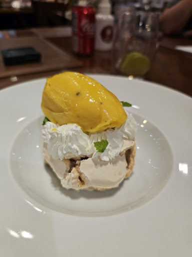 A sobremesa pavlova também é excelente, a massa com tinta de Lula nos agradou bastante.