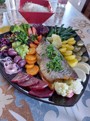 Dia 2: Pedimos uma truta recheada com maçã, acompanhada por legumes. Sensacional! Não sou um grande fã de peixe e costumo comer raramente. Esse foi o melhor que já experimentei. Tecnicamente perfeito. Suculento por dentro, pele crocante, bem temperado. O recheio de maçã combina muito. Os legumes estavam cozidos no ponto certo. Tinha uns picles ótimos. Vem, ainda, um molho de laranja (se não me engano) que deixa tudo ainda melhor.