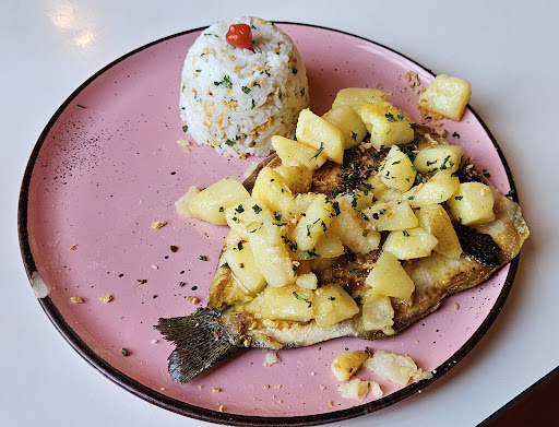Gostamos da truta, porém acredito que deveria vir com uma salada, legumes ou molho fresco. Truta é um peixe gorduroso, e veio acompanhado de arroz e batatas.