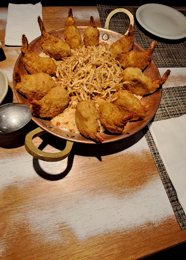 As recepcionistas não são simpáticas. Esperaram eu preencher o cadastro para liberar um local de espera para o meu sogro que é deficiente e estava de muletas. O mais desconfortável é o olhar de julgamento de uma pessoa preta para uma família preta, como se não pertence aquele local. Dito isso, vamos a análise da refeição que é o mais importante, embora não tenha sido. . Pedi um parmegiana para duas pessoas logo que cheguei. Um suco de maracujá e duas Pepsi Black. Os líquidos vieram e pedi um gratinado real. Para entrada pedi dois pastéis um de camarão e outro de carne de sol. Ambos vieram embebidos em óleo. Impossível de pegar com a mão sem se sujar. Sabor ok, mas extremamente gorduroso. Aguardamos 50 minutos e chegou o gratinado real. Particularmente achei sem graça. O arroz apesar de ter muita coisa era sem sabor. Faltava o básico, sal. As lâminas de amêndoas deveriam ser crocantes e estavam amolecidas dando um amargor ao prato desnecessário. O molho de frutas vermelhas parecia uma geleia aguada. Sem tempero sem acidez muito sem graça. Os camarões estavam ok no ponto certo. Nada surpreendente. Aguardei 15 minutos e tive de chamar o garçom para avisar que o primeiro prato ainda não tinha sido entregue. Finalizando de comer o gratinado ireal chega à parmegiana. Essa a carne bem macia, mas também insossa. A massa é molho estavam ok, mas nada diferente do que se faz em casa. Um prato seguro como solicitei. Como era aniversário de minha esposa recebemos (após avisar e pedir) a sobremesa de cortesia um Petit Gauteau que ficou mais tempo no forno e não desmanchava com um chantilly básico e um sorvete de coco bem insosso. Pelo menos nessa desastrosa experiência o garçom nos atendeu bem e foi simpático ao recusarmos o parabéns coletivo dos funcionários nos poupando desse ato de constrangimento obrigatório aos funcionários. Por favor parem de obrigá-los a isso. E constrangedor e muito antiquado. Vamos repensar o tempero desse cardápio e buscar pessoas diferenciadas para recepcionistas. Além de cuidar melhor do serviço. Esqueceu e atrasar um prato complexo de sabores e ingredientes eu entenderia, mais um filé de carne bovina com massa de talharim ( não fresca) e molho de tomate não poderia demorar esse tempo todo. Nem mesmo o arroz. Enfim, uma experiência deplorável e por isso a minha nota. Faço votos de que melhorem porque até ser obrigado por alguma convenção social não retorno e somente após meu retorno se perceber a evolução indico a alguém esse lugar de camarão que não foi um...