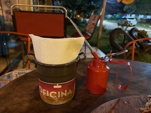 Esse restaurante foi inspirado nas oficinas antigas de carros, cada detalhe pensado em como reaproveitar as peças que nos dias atuais não seriam mais usadas para se tornar decoração. Os lustres são faroletes de fuscas, as poltronas são as de ônibus antigos, também podemos perceber metade de um Fusca e outra de uma Kombi modelo calcinha 😂😂😂 sem dúvida é uma obra de arte da reciclagem a parte. Bom mas vamos falar da comida, nesse restaurante se serve o que mais amamos comer PIZZA e sem sombra de dúvidas uma das mais gostosas que já comemos, afinal são preparadas em forno a lenha, o que da um gostinho especial não é verdade? O preço é padrão de mercado não é dos mais baratos mas também não é dos mais caros, e uma pizza serve muito bem 2 pessoas, eles ainda fazem com 2 sabores diferentes. Agora o atendimento haaaa sem nenhuma ponderação as pessoas daqui são muito simpáticas e prestativas e por isso vale a pena conhecer. Conhecemos em pandemia, nível vermelho então ficou...