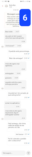 O atraso na entrega já seria aceitável, mas fui surpreendida por uma mensagem no aplicativo às 21h07, informando que meu pedido estava pronto há QUASE UMA HORA e questionando SE EU NÃO IRIA BUSCÁ-LO. Além disso, foi-me dito que eu havia escolhido uma "entrega parceira", mas no meu aplicativo aparece apenas "ENTREGA", sem especificar se é parceira ou própria do local. Afirmaram ainda que fui avisada pelo aplicativo, o que não ocorreu, como pode ser constatado pelos horários nas fotos 4, 5, 6, 7, 8 e 9, quando a informação foi REALMENTE enviada pelo CHAT do aplicativo e por ligação.