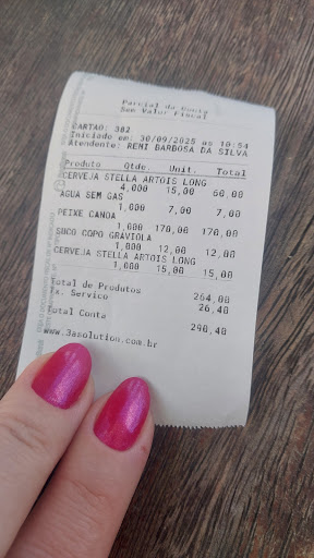 Quando finalmente conseguimos almoçar, a comida estava longe de corresponder à apresentação das fotos. O peixe chegou morno, completamente encharcado de óleo, e a comida, em geral, era extremamente gordurosa. Após a refeição, tivemos problemas digestivos, o que reforçou a má impressão.
