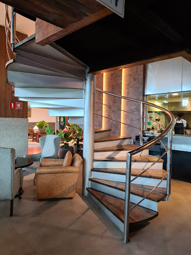 Posteriormente, notamos um espaço com puffs que parecia mais agradável. Fomos até lá e nos sentamos, momento em que uma funcionária — uma mulher de pele parda a preta, cabelos curtos aparentemente escovados — se aproximou de forma grosseira e afirmou:
