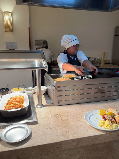 La opción para desayunar, almorzar y cenar (en caso de que no tengas reserva en otro restaurante). El desayunar al ser la única opción es un despelote por la cantidad de gente, espera y servicio. Como que no dan abasto. Muchas veces llegas y las mesas vacías están todas sucias porque no llegaron a limpiarlas. La cena es un poco menos lío porque se divide la asistencia entre los demás restaurantes del hotel. Ya para el almuerzo me sorprendió. Va mucha menos gente (por estar en la pileta o la playa) y por sobre todo haber muy buena variedad de comida y todo...