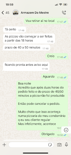 Do dia 18/05/2025 fiz um pedido às 17:40. A pessoa que me antendeu informou que em 40/50 minutos. Duas horas depois quando entrei em contato pra cancelar, visto que já tinha mais que estourado o prazo dado, ainda ouvi que EU DEVERIA TER ENTRADO EM CONTATO PRA SABER SE TAVA PRONTO, quando claramente a pessoa se comprometeu a informar para que eu retirasse. Além de não ter meu pedido , ainda senti uma ponta de deboche do atendente. Não sei que tipo de treinamento é oferecido, mas ele deixou um (agora ex) cliente com fome, frustrado e sequer ofereceu um pedido de desculpas decente.