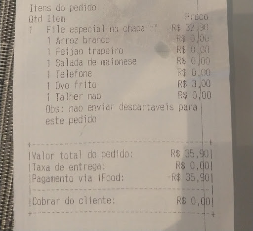 Read moreA comida simples precisa melhorar para virar uma boa a excelente comida, mas está no caminho certo. O A parmegiana bom nada demais pode melhorar a carne mas bom produto. A almôndega ou vcs melhoram muito ou tira do cardápio, muito dura almôndega não se faz daquele jeito, muito dura mas dura mesmo e bas ta colocar pão no leite de molho e misturar com a carne que ganha maciez.os acompanhamentos precisam melhorar o purê é bom mas falta manteiga e leite e sal todos os acompanhamentos estavam completamente sem sal incrível , o macarrão bom mas o molho pode melhorar com algumas ervas e a maionese boa mas tbm sem Sal , no limite os pratos de ter um problema com o cliente qualquer erro vcs vão ouvir oq não quer, mas a comida é relativamente boa , a quantidade boa até aumentaria um pouco o preço e dá para fazer uma...