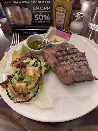 Read moreFui hoje pela primeira e última vez no Madero, sempre ví recomendações e ficava imaginando o dia de comer no Madero sempre quando olhava a propaganda nas revistas dos voos que faço. Após comer o schnitzel tive a sensação de comer um frango a milanesa, não senti nenhum sabor do parmesão nem do lombo.... Meu marido comeu um filé argentino e se não fosse o chimichurri estaria sem graça. Mesmo assim, para não perder a esperança pedimos um hamburguer para levar e aí que foi a pior experiência. Enquanto estávamos esperando, fiquei curiando a marca da mostarda e do catchup, enquanto eu estava lendo atentamente o rótulo meu marido tirou da minha mão e me alertou que havia uma barata. Isso mesmo gente! Uma barata daquelas pequeninas e finas. Eu e meu marido levantamos e o garçon arrumou outra mesa pra gente e avisamos que não queríamos porque estávamos apenas esperando o hamburguer. O restaurante estava cheio e eu não sei fazer escandâlos, apenas falei olha a barata, porque deve ter mais, afinal sabemos que quando a barata é pequena é sinal que há um foco, pois aprendi que uma barata esclode mais de 40, então imaginem como deve estar infestado! Como as mesas são de madeira e algumas possuem um corte no meio elas estavam alojadas lá. A iluminação do ambiente não ajuda a enxergar as baratas devido se camuflarem com a cor da mesa. Mas esperei para pagar e fomos embora e idecepcionada , pois em nenhum momento foram conversar com a gente e se descupar pela terrível experiência. Saí de lá com a sensação de estar com baratas em minhca cabeça e estou dececpionada até o momento. Por isso gente, infelizmente, tenho certeza que no Madero eu e o meu marido, não voltamos nunca mais e nem recomendaremos. E aos funcionários e gerente, apenas como toque, por mais que o restaurante estivesse cheio deveriam dar a devida atenção ao caso o que parece que não foi a ainda arrumaram a mesa para outros sentarem. Me arrependo de não ter feito um escândalo e de ter impedido meu marido de fazer, por ser muito tímida e não gostar de chamar a atenção fiquei alí pasma ainda aguardando para pagar. Ass:...