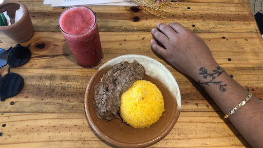 Além do cuscuz fofinho com ovo mexido caprichado, pedi também um café com leite vegetal (delicinha) e um suco de laranja com morango para caprichar na vitamina C, pois dormir no ar-condicionado por tantos dias me deixou resfriada e com uma tossinha chata.