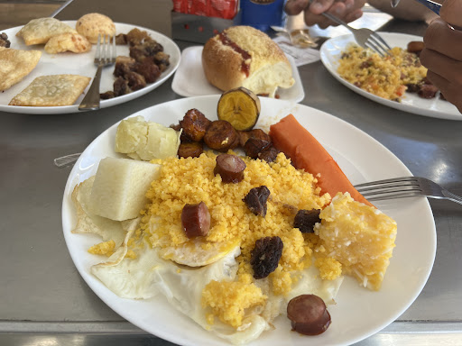 Café da manhã com o que existe no nordeste acompanhado de proteínas. Encontrei batata doce, inhame, aipim, banana da terra, cuscuz de milho, frango ao molho com batatas, ensopado de boi, carne frita, ovos, rabada etc. Servem suco em jarra ou copo, café, sanduíches etc. O preço é no quilo e aceitável. Costuma abrir cedo e tem um bom movimento no início das manhãs. São poucas mesas, como cheguei depois das 08h acabei usando uma mesa na parte interna. O atendimento é bom e os funcionários são atenciosos e rápidos na entrega dos pedidos. Já estive duas vezes e as opções e a qualidade permaneceram da mesma forma,...