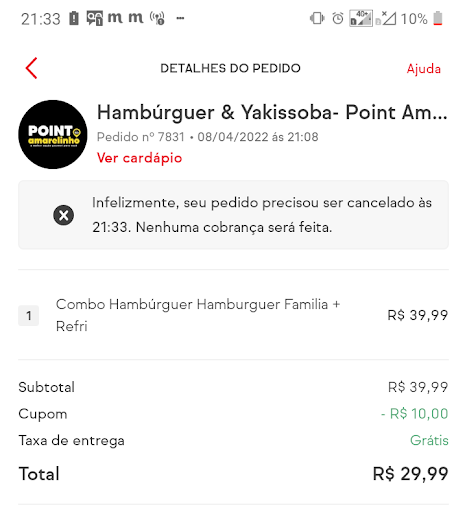 Read moreGostaria de deixar aqui a minha insatisfação! Realizei um pedido pelo Ifood, nisso as 21:00 horas, o pedido estava sendo preparado, com previsão de entrega as 21:30, quando completou as 21:38 eles cancelaram o pedido... Direito deles, beleza, mas sacanagem... Se não iam preparar o pedido, por que não cancelaram antes? Me fizeram perder tempo, e isso não se faz, é uma falta...