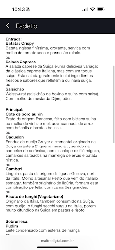 O fondue, apesar de ter reposição, tinha sabor suave demais, com predomínio de amido e pouco gosto de queijo. O de chocolate também não achei tão saboroso, melhor comer os acompanhamentos puros. O aparelho de raclette, modo de preparo de queijo que normalmente esperamos ver derretendo e sendo raspado na hora, foi apenas colocado na mesa sem instruções, e tivemos que solicitar ajuda para entender o funcionamento.