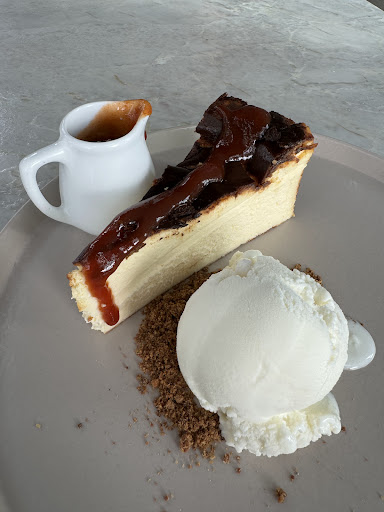🥧As sobremesas são delicadas e a cara da proposta do restaurante. Optamos e amamos a Torta basca, que é um cheesecake assado e caramelizado que vem acompanhado com calda de goiabada, farofa de amêndoas e sorvete de nata.