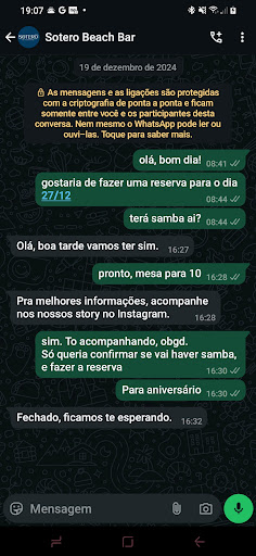 Estava procurando um lugar para curtir e comemorar meu aniversário e vi um anuncio no Instagram deste bar. Entrei, pesquisei e achei que o lugar atenderia as minhas expectativas, visto que o ambiente é climatizado, tem samba ao vivo e gente bonita. Entrei em contato através do número que fica no link do instagram e perguntei se na referida data 27/12 teria samba, e se sim, gostaria de fazer a reserva. A pessoa que me respondeu confirnou sobre o samba e acrescentou: